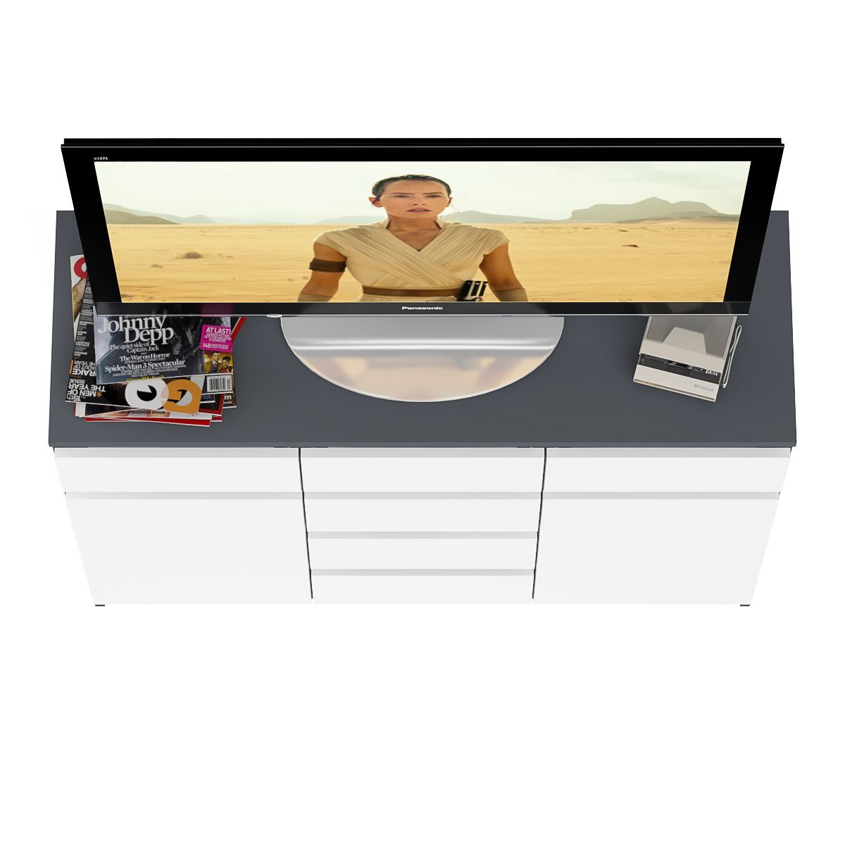 Комод оборудован шестью выдвижными ящиками и двумя закрытыми отделениями с полками. В верхней части комода расположены три ящика, под ними в центре отделение с ещё тремя ящиками и по бокам отделения с дверками. Продуманная конструкция позволяет убрать лишние предметы, тем самым сохраняя единый стиль оформления помещения. Отсутствие ручек главное преимущество данной модели. Роль ручек выполняют сами фасады. Открывание ящиков и дверей производится за счет пространства между планками и фасадами. Выдвижные ящики на роликовых направляющих L=350 мм. неполного выдвижения обеспечивают комфортную эксплуатацию. На нижних кромках опор предусмотрены пластиковые подпятники для защиты поверхности пола от механических повреждений.