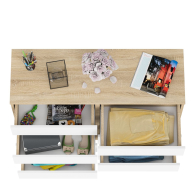 Комод оборудован восемью выдвижными ящиками, расположеными по четыре в два ряда. Продуманная конструкция позволяет убрать лишние предметы, тем самым сохраняя единый стиль оформления помещения. Отсутствие ручек главное преимущество данной модели. Роль ручек выполняют сами фасады. Открывание ящиков производится за счет пространства между планками и фасадами. Выдвижные ящики на роликовых направляющих L=350 мм. неполного выдвижения обеспечивают комфортную эксплуатацию. На нижних кромках опор предусмотрены пластиковые подпятники для защиты поверхности пола от механических повреждений.