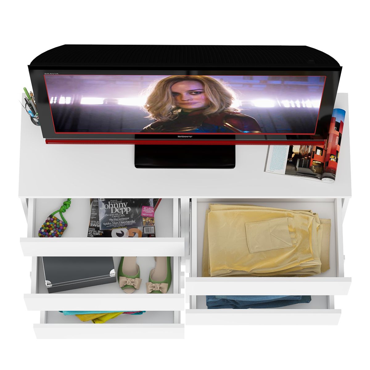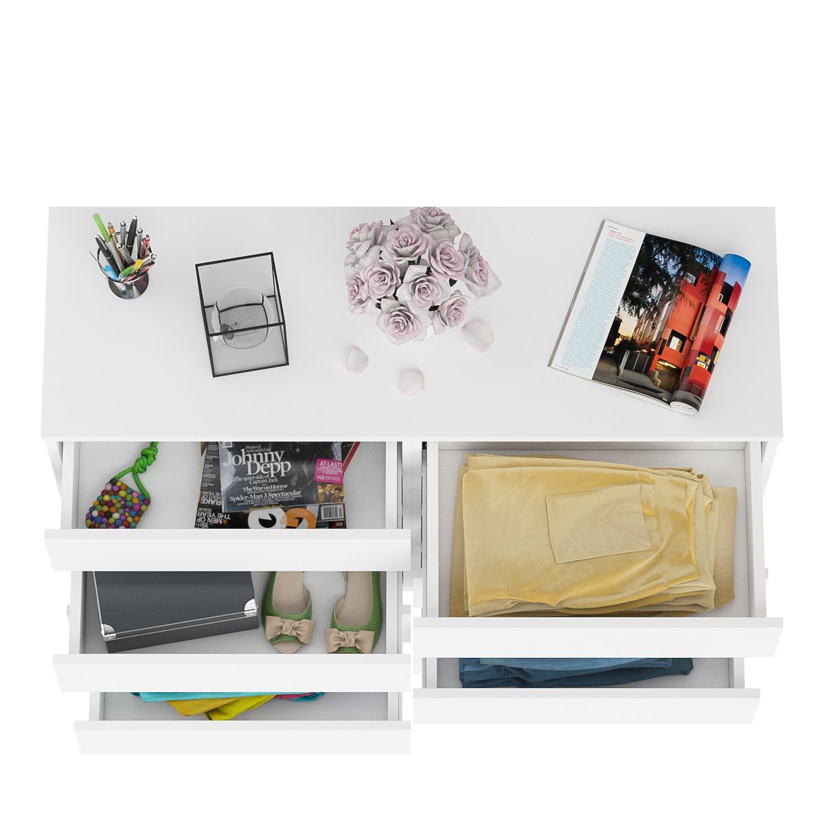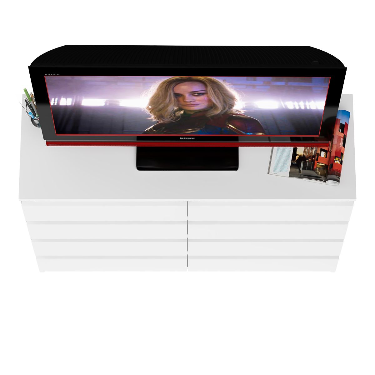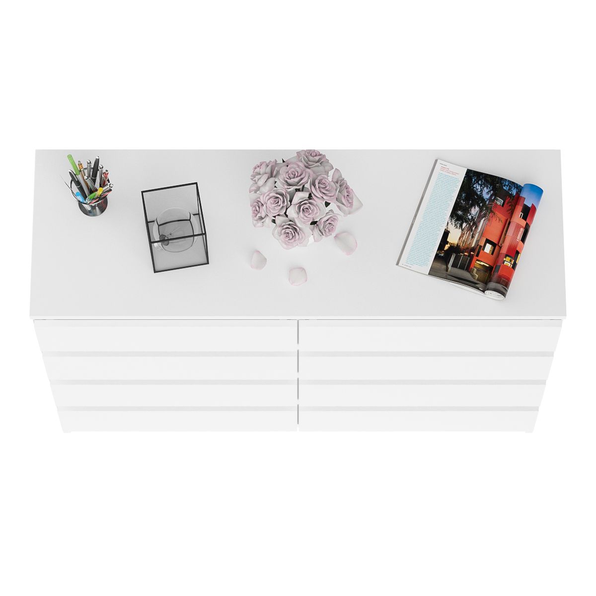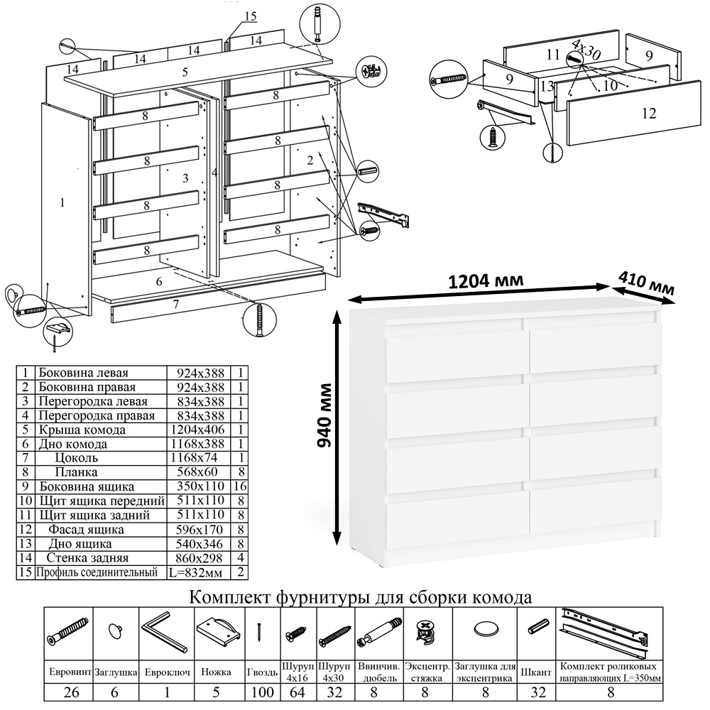 Комод оборудован восемью выдвижными ящиками, расположеными по четыре в два ряда. Продуманная конструкция позволяет убрать лишние предметы, тем самым сохраняя единый стиль оформления помещения. Отсутствие ручек главное преимущество данной модели. Роль ручек выполняют сами фасады. Открывание ящиков производится за счет пространства между планками и фасадами. Выдвижные ящики на роликовых направляющих L=350 мм. неполного выдвижения обеспечивают комфортную эксплуатацию. На нижних кромках опор предусмотрены пластиковые подпятники для защиты поверхности пола от механических повреждений.