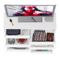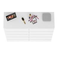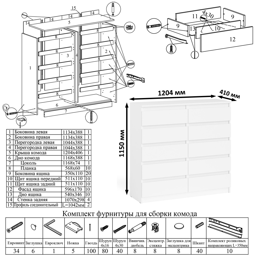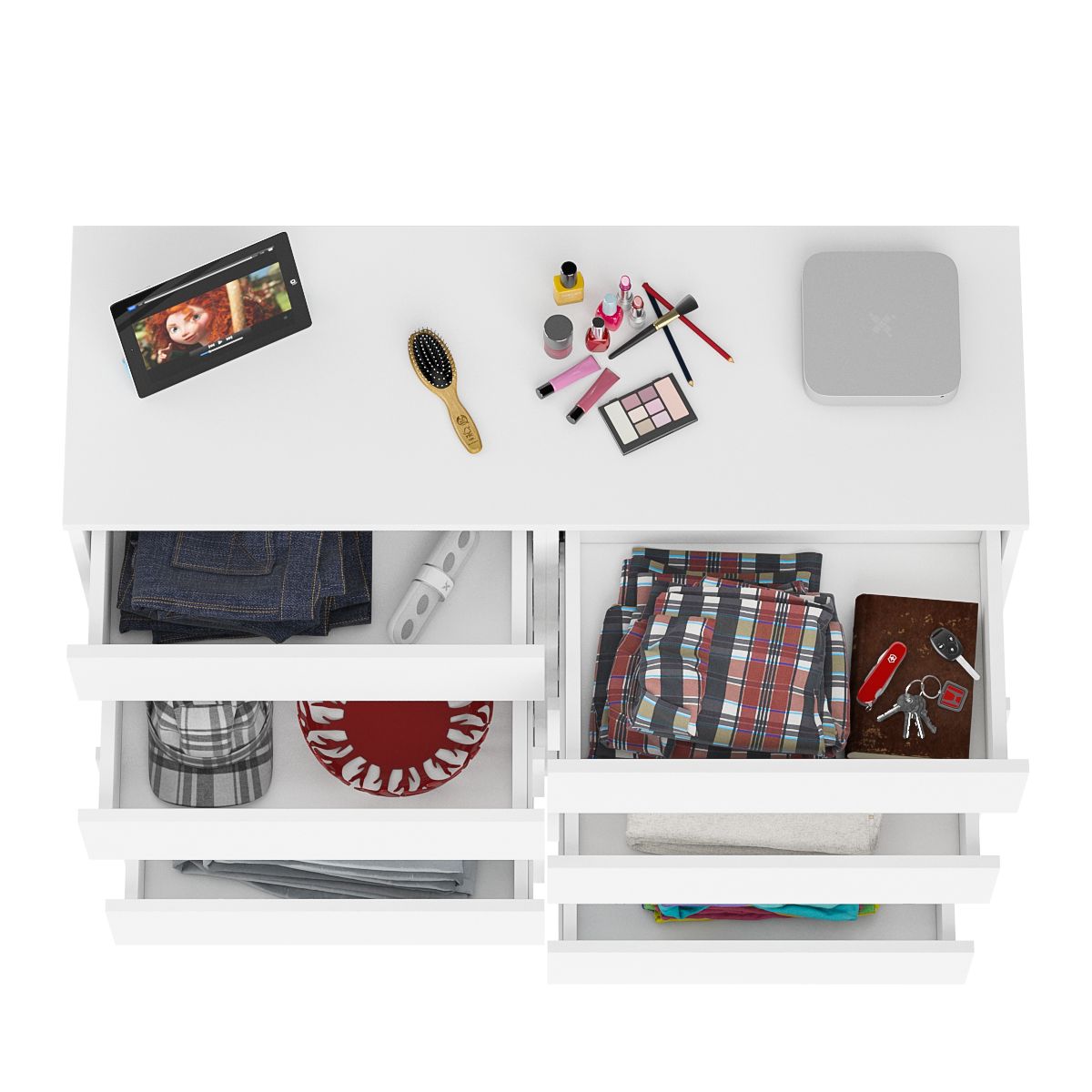 Комод оборудован десятью выдвижными ящиками, расположеными по пять в два ряда. Продуманная конструкция позволяет убрать лишние предметы, тем самым сохраняя единый стиль оформления помещения. Отсутствие ручек главное преимущество данной модели. Роль ручек выполняют сами фасады. Открывание ящиков производится за счет пространства между планками и фасадами. Выдвижные ящики на роликовых направляющих L=350 мм. неполного выдвижения обеспечивают комфортную эксплуатацию. На нижних кромках опор предусмотрены пластиковые подпятники для защиты поверхности пола от механических повреждений.