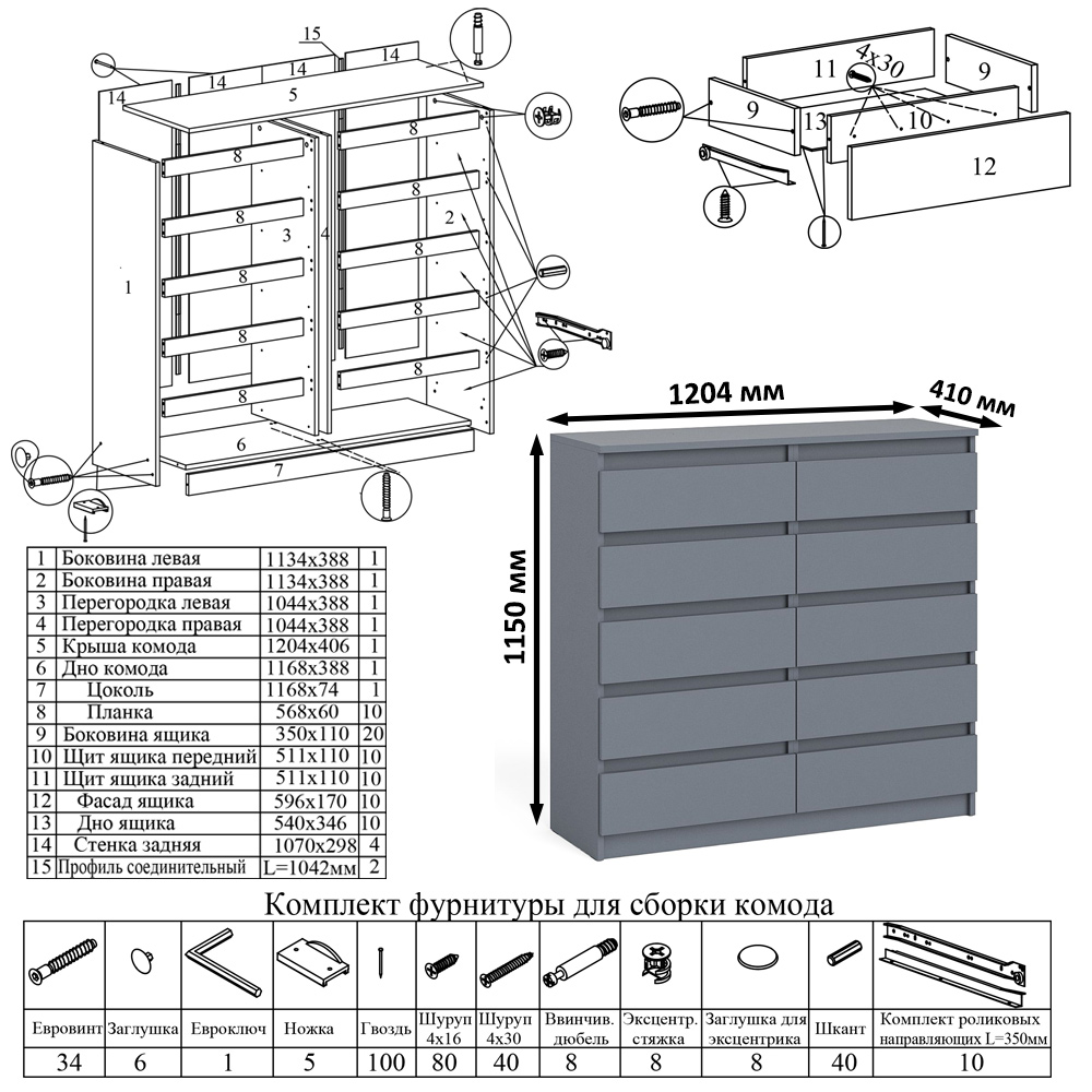 Корпус и фасады изготовлены из экологически чистой ламинированной ДСП 16 мм, торцы окромлены ПХВ плёнкой 0,4 мм. Лицевая фурнитура отсутствует - все фасады открываются за край. Поставляется в разобранном виде в надёжной упаковке, с комплектом сборочной фурнитуры и инструкцией по сборке.