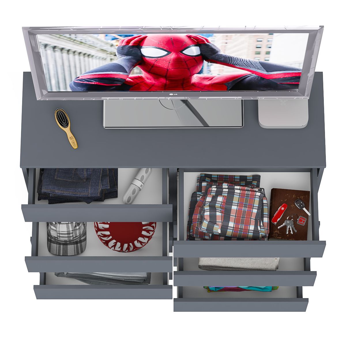 Комод оборудован десятью выдвижными ящиками, расположеными по пять в два ряда. Продуманная конструкция позволяет убрать лишние предметы, тем самым сохраняя единый стиль оформления помещения. Отсутствие ручек главное преимущество данной модели. Роль ручек выполняют сами фасады. Открывание ящиков производится за счет пространства между планками и фасадами. Выдвижные ящики на роликовых направляющих L=350 мм. неполного выдвижения обеспечивают комфортную эксплуатацию. На нижних кромках опор предусмотрены пластиковые подпятники для защиты поверхности пола от механических повреждений.