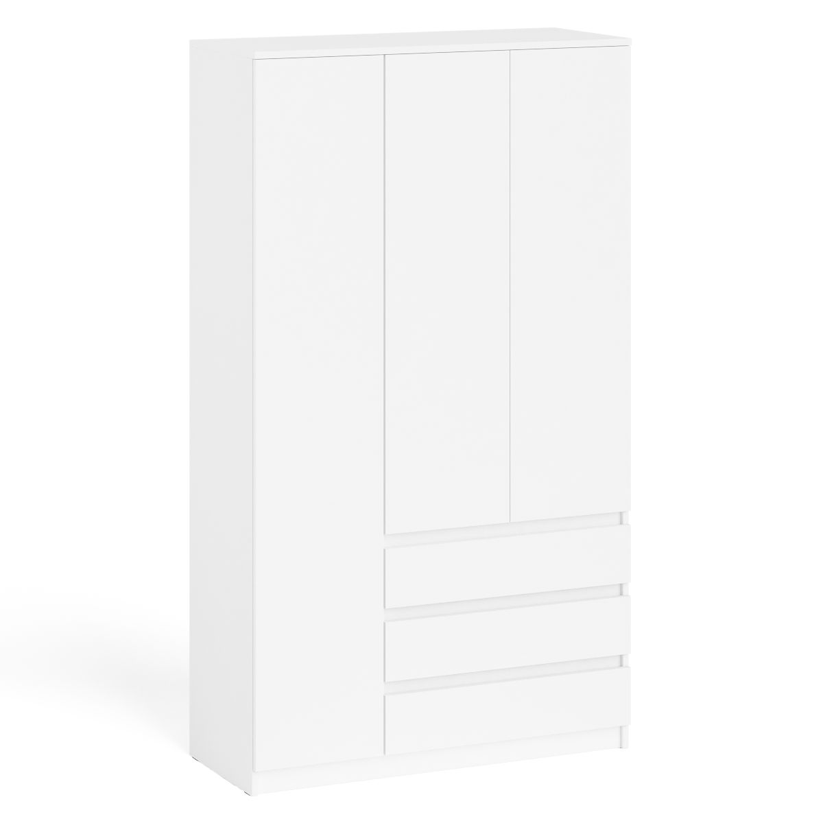 Оборудован тремя распашными дверями и тремя выдвижными ящиками. Слева за дверкой расположено отделение с горизонтальной штангой для одежды на плечиках, антресольной полкой и нижней нишей. Справа сверху за дверьми отделение с тремя полками и снизу тремя выдвижными ящиками. Шкаф-комод не универсален при сборке - отделение с ящиками располагается только справа. Продуманная конструкция позволяет убрать лишние предметы, тем самым сохраняя единый стиль оформления помещения. Отсутствие ручек главное преимущество данной модели.
