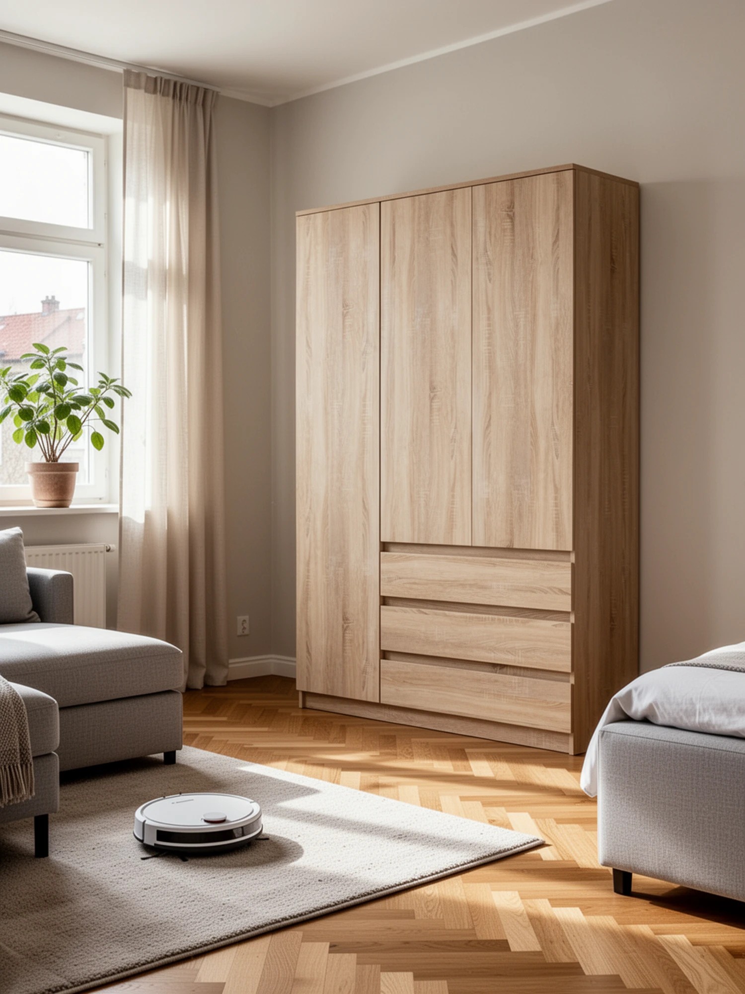 На нижних кромках опор предусмотрены пластиковые подпятники для защиты поверхности пола от механических повреждений. Корпус и фасады изготовлены из экологически чистой ламинированной ДСП 16 мм, торцы окромлены ПХВ плёнкой 0,4 мм. Лицевая фурнитура отсутствует - все фасады открываются за край. Поставляется широкий шкаф-комод Мори МШ1200.1 в разобранном виде в надёжной упаковке, с комплектом сборочной фурнитуры и инструкцией по сборке.