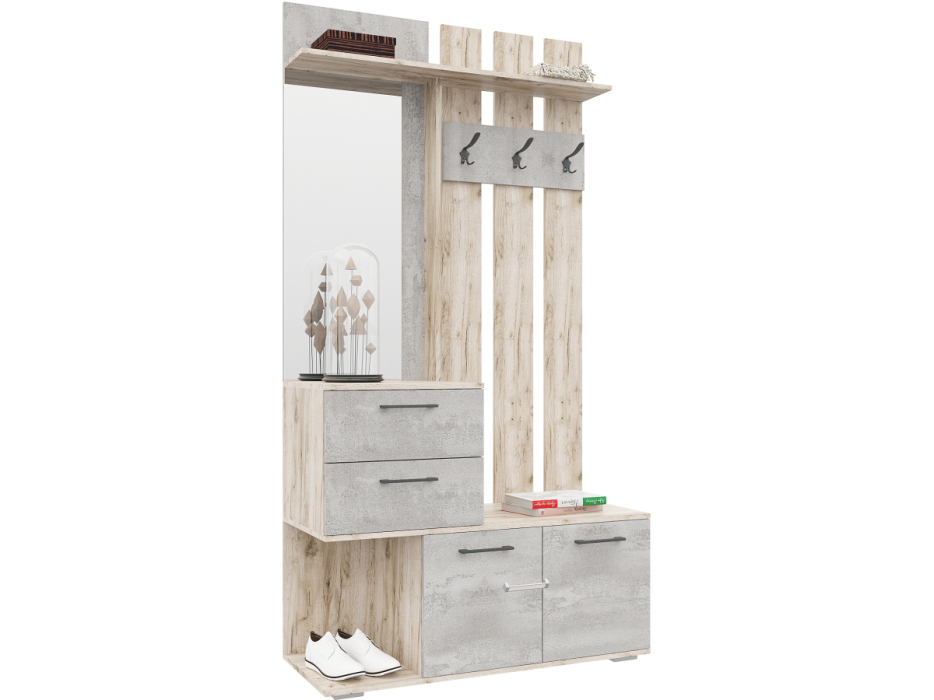 Прихожая Бостон ВШ-1 дуб крафт серый / бетонный камень; ЛДСП. Прихожая имеет два ящика, полки под обувь, зеркало и полку для головных уборов