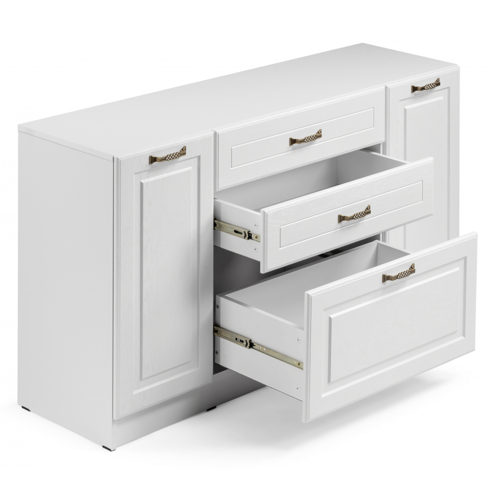 Комод Ливерпуль белый / ясень ваниль; МДФ, ЛДСП. Имеется 3 вместительных ящика и по 2 полки по бокам. Красивый и практичный вариант. Комод подойдёт также и под телевизор. Ручки металлические