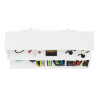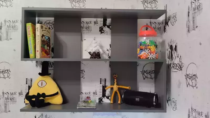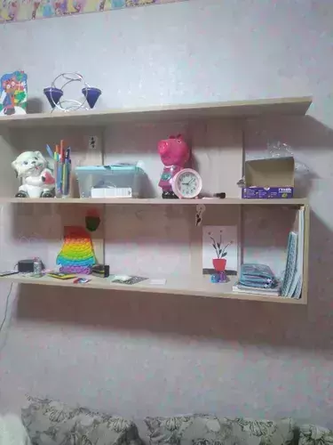 Представляет из себя 3 полки с боковыми стенками по диагонали соединеных двумя задними панелями. Навесы и шурупы входят в комплект поставки, фурнитура (саморез, дюпель) непосредственно для крепления полки к стене НЕТ. При изготовлении используются экологически чистые материалы и отделка.