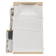 Кровать оборудована надёжным основанием под матрас из настила из ДСП. Матрас приобретается отдельно. В основании кровати расположены два вместительных ящика для хранения постельных принадлежностей и личных вещей. Предусмотрена универсальная схема сборки бельевых ящиков - они могут быть установлены с правой или с левой стороны кровати.