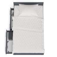 Кровать оборудована надёжным основанием под матрас из настила из ДСП. Матрас приобретается отдельно. В основании кровати расположены два вместительных ящика для хранения постельных принадлежностей и личных вещей. Предусмотрена универсальная схема сборки бельевых ящиков - они могут быть установлены с правой или с левой стороны кровати.