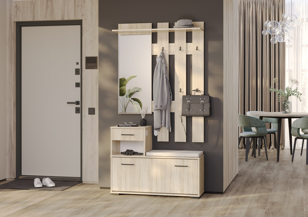 В данной комплектации мебель для прихожих состоит из тумбы под обувь и вешалки с зеркалом. С этим компактным, продуманным и элегантным гарнитуром прихожая будет красивой, опрятной, удобной, стильной, современной и уютной.