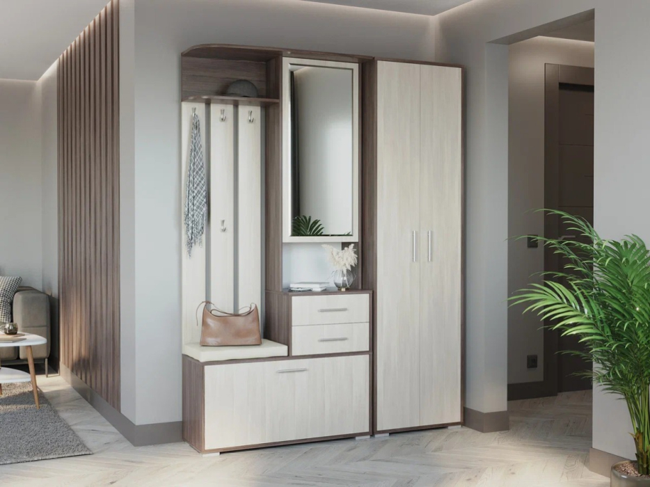 Комплект для прихожей Домино 2-3430+2-3431 - практичный комфорт Вашего дома или офиса. Данная модель гармонично сочетает в себе распашной шкаф, открытую вешалку, шкаф с зеркальной дверкой, тумбу для обуви и банкетку.
