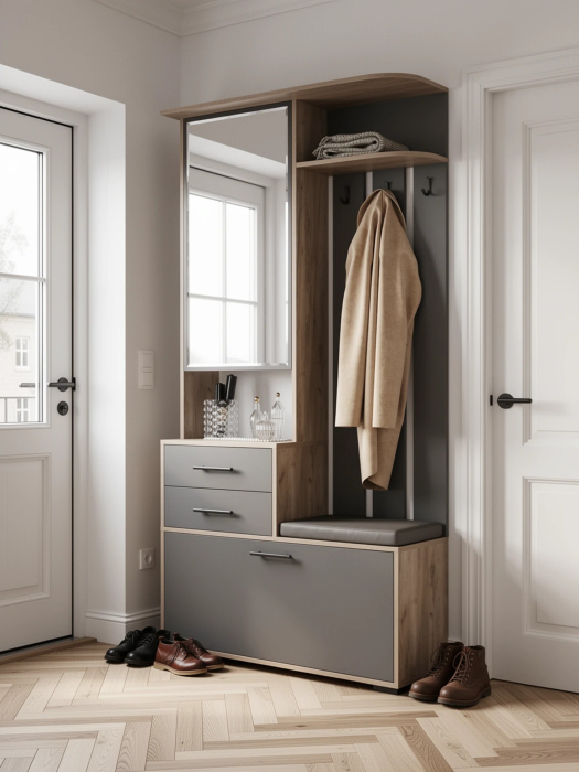 Открытая вешалка располагает четырьмя трёхрожковыми крючками и антресольной полочкой для головных уборов. За распашной дверкой зеркального шкафчика притаились три полочки. Не смотря на компактность, шкафчик порадует Вас вместительностью. В двух выдвижных ящичках тумбы достаточно места для нужных под рукой мелочей, ключей, перчаток, крема для обуви или дождевичка. За откидной дверкой тумбы для обуви расположены два отделения, одно для небольшой обуви, разделено горизонтальной полочкой на две части, второе - для высокой обуви. Половина верхнего горизонта выполнена в виде банкетки с мягким сиденьем, на которое удобно присесть. А, благодаря универсальной сборке, Вы сможете собрать прихожую с максимальным комфортом для себя.
