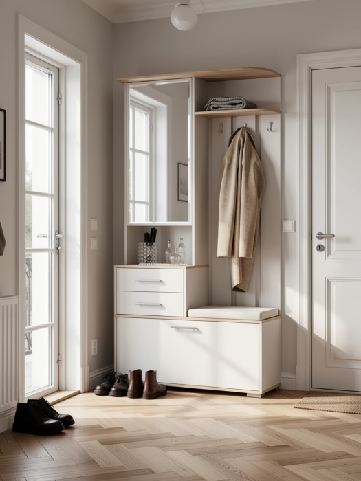 Открытая вешалка располагает четырьмя трёхрожковыми крючками и антресольной полочкой для головных уборов. За распашной дверкой зеркального шкафчика притаились три полочки. Не смотря на компактность, шкафчик порадует Вас вместительностью. В двух выдвижных ящичках тумбы достаточно места для нужных под рукой мелочей, ключей, перчаток, крема для обуви или дождевичка. За откидной дверкой тумбы для обуви расположены два отделения, одно для небольшой обуви, разделено горизонтальной полочкой на две части, второе - для высокой обуви. Половина верхнего горизонта выполнена в виде банкетки с мягким сиденьем, на которое удобно присесть. А, благодаря универсальной сборке, Вы сможете собрать прихожую с максимальным комфортом для себя.