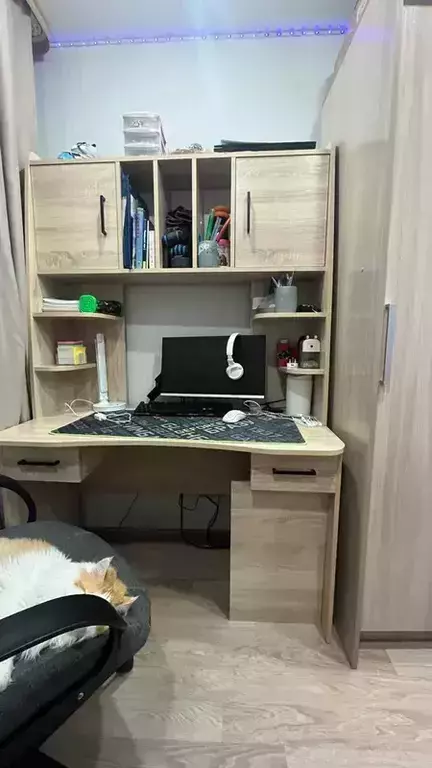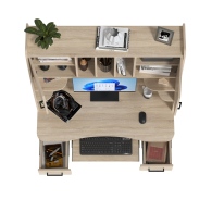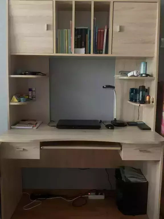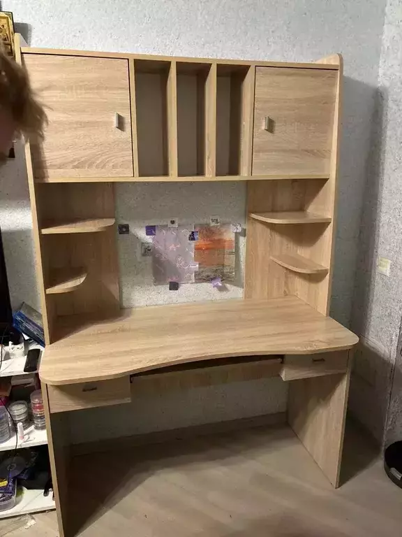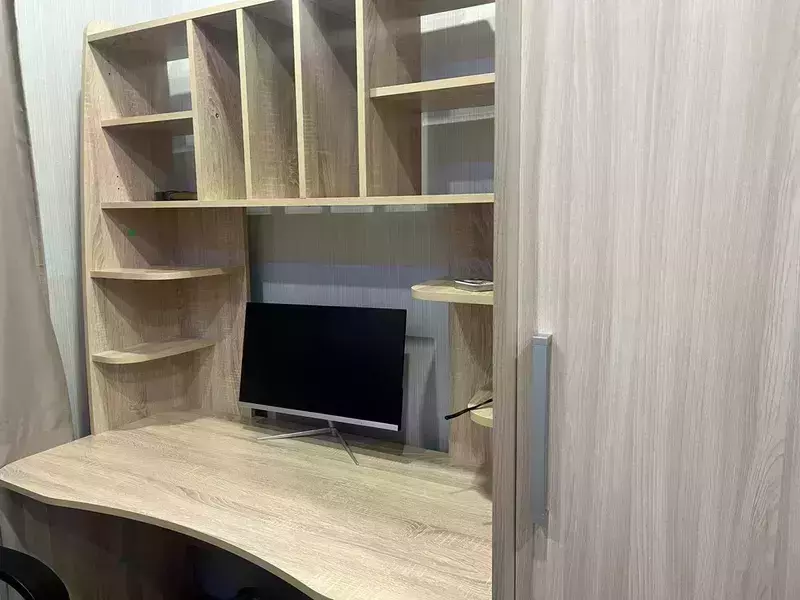 Столешница с мягко закруглёнными краями комфортна и безопасна. Под ней по краям расположены два выдвижных ящика для канцелярии и удобная полка для клавиатуры по центру. Надстройка выполнена в виде стеллажа - два закрытых отделения с дверцами, открытые полки и ниша с перегородками легко разместят книги, документы и другие нужные вещи. Ниша под монитор или ноутбук расположена на удобной высоте — для продуктивной работы и учёбы.
