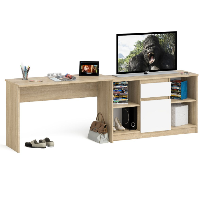 Комплектация включает стол письменный Мори МСП1200.1 и тумбу ТВ Мори МТВ1204.1. Продуманная конструкция позволяет убрать лишние предметы, тем самым сохраняя единый стиль оформления помещения. Отсутствие ручек главное преимущество данной модели. Роль ручек выполняют сами фасады. Стол письменный Мори МСП1200.1 - простой аккуратный стол без тумб и ящиков - минималистичный дизайн и доступная цена. Столещница размером 120х50 см. вместит все необходимые принадлежности для работы. По бокам располагаются две опоры из ЛДСП выполняющие роль ножек. С задней стороны стола имеется царга - верхняя соединительная планка между ножками. Тумба ТВ Мори МТВ1204.1 состоит из двух открытых ниш по бокам и ящика и закрытой нишей по центру. Все ниши имеет полочку по середине. На тумбе достаточно места для размещения телевизора дигональю 47 дюймов. Можно использовать как ТВ тумбу, так и обычную для хранения и размещения Ваших вещей.