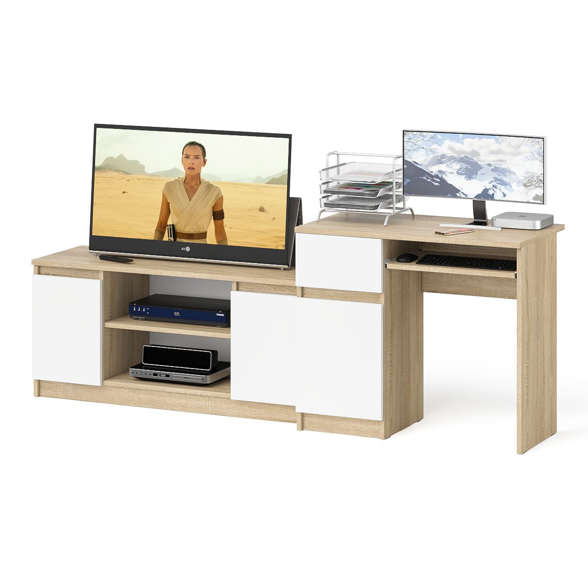 Комплектация включает стол компьютерный Мори МС-1 левый и тумбу ТВ Мори МТВ1200.1. Продуманная конструкция позволяет убрать лишние предметы, тем самым сохраняя единый стиль оформления помещения. Отсутствие ручек главное преимущество данной модели. Роль ручек выполняют сами фасады. Небольшой стол компьютерный Мори МС-1 левый с тумбой и выдвижной панелью для клавиатуры. Тумба имеет нишу с полочкой за распашной дверкой и выдвижной ящик на роликовых направляющих. Стол компьютерный Мори МС-1 левый не имеет универсальной сборки - выдвижной ящик расположен слева. Тумба ТВ Мори МТВ1200.1 состоит из открытой ниши по центру и двумя закрытыми распашными дверками по краям. Все ниши имеет полочку по середине. На тумбе достаточно места для размещения телевизора дигональю 47 дюймов. Можно использовать как ТВ тумбу, так и обычную для хранения и размещения Ваших вещей.