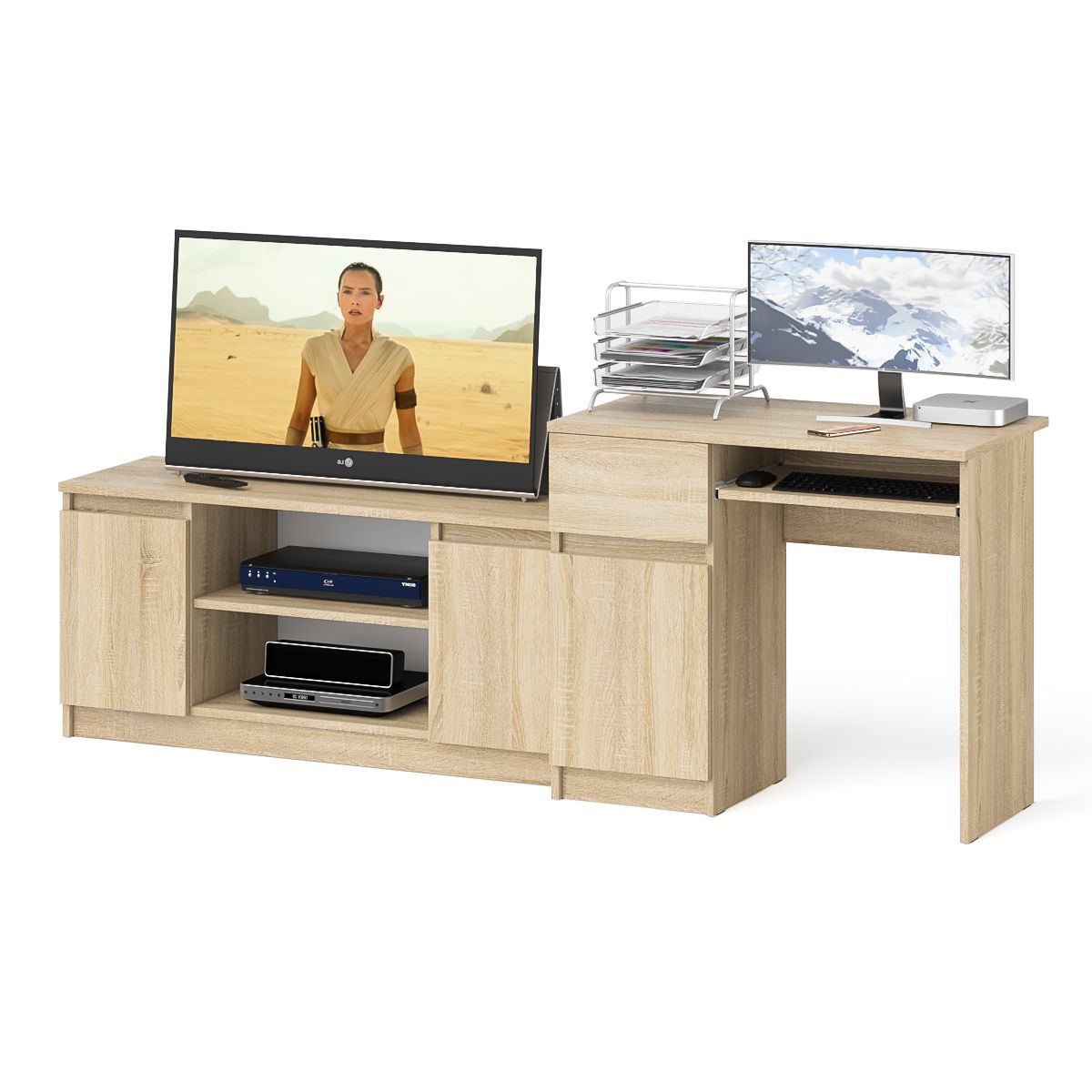 Комплектация включает стол компьютерный Мори МС-1 левый и тумбу ТВ Мори МТВ1200.1. Продуманная конструкция позволяет убрать лишние предметы, тем самым сохраняя единый стиль оформления помещения. Отсутствие ручек главное преимущество данной модели. Роль ручек выполняют сами фасады. Небольшой стол компьютерный Мори МС-1 левый с тумбой и выдвижной панелью для клавиатуры. Тумба имеет нишу с полочкой за распашной дверкой и выдвижной ящик на роликовых направляющих. Стол компьютерный Мори МС-1 левый не имеет универсальной сборки - выдвижной ящик расположен слева. Тумба ТВ Мори МТВ1200.1 состоит из открытой ниши по центру и двумя закрытыми распашными дверками по краям. Все ниши имеет полочку по середине. На тумбе достаточно места для размещения телевизора дигональю 47 дюймов. Можно использовать как ТВ тумбу, так и обычную для хранения и размещения Ваших вещей.