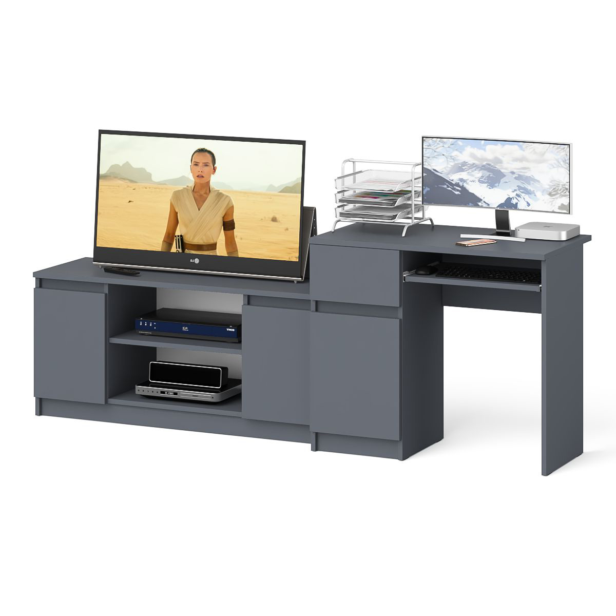 Комплектация включает стол компьютерный Мори МС-1 левый и тумбу ТВ Мори МТВ1200.1. Продуманная конструкция позволяет убрать лишние предметы, тем самым сохраняя единый стиль оформления помещения. Отсутствие ручек главное преимущество данной модели. Роль ручек выполняют сами фасады. Небольшой стол компьютерный Мори МС-1 левый с тумбой и выдвижной панелью для клавиатуры. Тумба имеет нишу с полочкой за распашной дверкой и выдвижной ящик на роликовых направляющих. Стол компьютерный Мори МС-1 левый не имеет универсальной сборки - выдвижной ящик расположен слева. Тумба ТВ Мори МТВ1200.1 состоит из открытой ниши по центру и двумя закрытыми распашными дверками по краям. Все ниши имеет полочку по середине. На тумбе достаточно места для размещения телевизора дигональю 47 дюймов. Можно использовать как ТВ тумбу, так и обычную для хранения и размещения Ваших вещей.