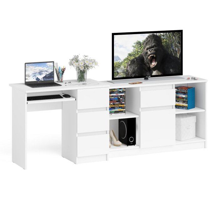 Комплектация включает стол компьютерный Мори МС-6 правый и тумбу ТВ Мори МТВ1204.1. Продуманная конструкция позволяет убрать лишние предметы, тем самым сохраняя единый стиль оформления помещения. Роль ручек выполняют сами фасады. Аккуратный стол Мори МС-6 компьютерный правый с тумбой и выдвижной панелью для клавиатуры. Тумба имеет три выдвижных ящика на роликовых направляющих. Стол компьютерный три ящика Мори МС-6 правый не имеет универсальной сборки - выдвижной ящик расположен слева. Тумба ТВ Мори МТВ1204.1 состоит из двух открытых ниш по бокам и ящика и закрытой нишей по центру. Все ниши имеет полочку по середине. На тумбе достаточно места для размещения телевизора дигональю 47 дюймов. Можно использовать как ТВ тумбу, так и обычную для хранения и размещения Ваших вещей.