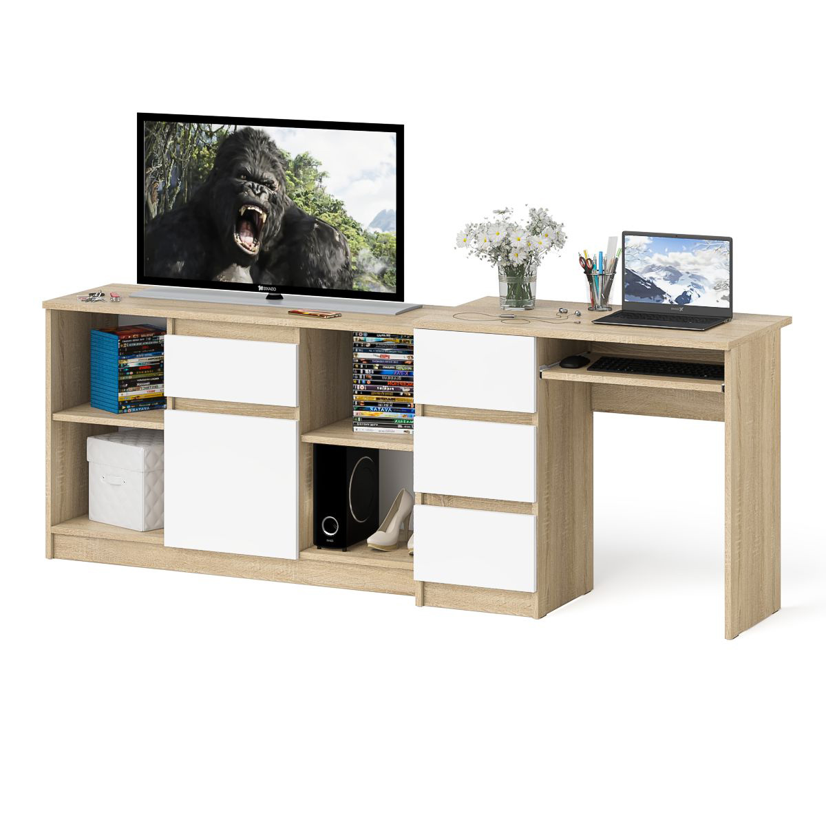 Комплектация включает стол компьютерный Мори МС-6 левый и тумбу ТВ Мори МТВ1204.1. Продуманная конструкция позволяет убрать лишние предметы, тем самым сохраняя единый стиль оформления помещения. Роль ручек выполняют сами фасады. Небольшой Стол Мори МС-6 левый компьютерный с тумбой и выдвижной панелью для клавиатуры. Тумба имеет три выдвижных ящика на роликовых направляющих. Стол компьютерный три ящика Мори МС-6 левый не имеет универсальной сборки - выдвижной ящик расположен слева. Тумба ТВ Мори МТВ1204.1 состоит из двух открытых ниш по бокам и ящика и закрытой нишей по центру. Все ниши имеет полочку по середине. На тумбе достаточно места для размещения телевизора дигональю 47 дюймов. Можно использовать как ТВ тумбу, так и обычную для хранения и размещения Ваших вещей.