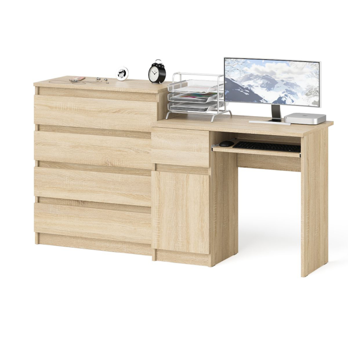 Комплектация включает стол компьютерный Мори МС-1 левый и комод Мори МК800.4. Продуманная конструкция позволяет убрать лишние предметы, тем самым сохраняя единый стиль оформления помещения. Роль ручек выполняют сами фасады. Небольшой стол компьютерный Мори МС-1 левый с тумбой и выдвижной панелью для клавиатуры. Тумба имеет нишу с полочкой за распашной дверкой и выдвижной ящик на роликовых направляющих. Стол компьютерный Мори МС-1 левый не имеет универсальной сборки - выдвижной ящик расположен слева. Классический комод Мори МК800.4 с четырьмя выдвижными ящиками на роликовых направляющих.