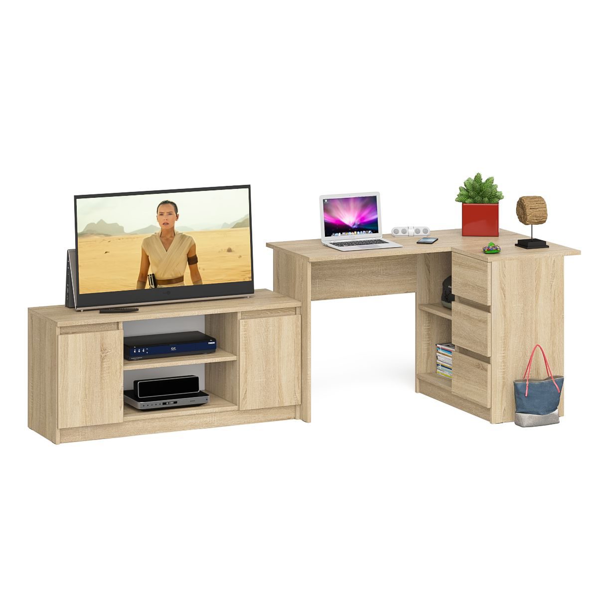 Комплектация включает стол компьютерный Мори МС-16 правый и тумбу ТВ Мори МТВ1200.1. Продуманная конструкция позволяет убрать лишние предметы, тем самым сохраняя единый стиль оформления помещения. Роль ручек выполняют сами фасады. Угловой компьютерный стол Мори МС-16 правый - конструктивно тумба со столешницей образуют угол. Тумба имеет 3 выдвижных ящика и нишу с полкой по середине. Угловой компьютерный стол Мори МС-16 правый не универсален при сборке - тумба с ящиками располагается справа. Тумба ТВ Мори МТВ1200.1 состоит из открытой ниши по центру и двумя закрытыми распашными дверками по краям. Все ниши имеет полочку по середине. На тумбе достаточно места для размещения телевизора дигональю 47 дюймов. Можно использовать как ТВ тумбу, так и обычную для хранения и размещения Ваших вещей.