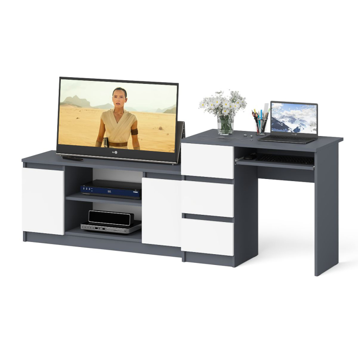 Комплектация включает стол компьютерный Мори МС-6 левый и тумбу ТВ Мори МТВ1200.1. Продуманная конструкция позволяет убрать лишние предметы, тем самым сохраняя единый стиль оформления помещения. Отсутствие ручек главное преимущество данной модели. Роль ручек выполняют сами фасады. Небольшой Стол Мори МС-6 левый компьютерный с тумбой и выдвижной панелью для клавиатуры. Тумба имеет три выдвижных ящика на роликовых направляющих. Стол компьютерный три ящика Мори МС-6 левый не имеет универсальной сборки - выдвижные ящики расположены слева. Тумба ТВ Мори МТВ1200.1 состоит из открытой ниши по центру и двумя закрытыми распашными дверками по краям. Все ниши имеет полочку по середине. На тумбе достаточно места для размещения телевизора диагональю 47 дюймов. Можно использовать как ТВ тумбу, так и обычную для хранения и размещения Ваших вещей.