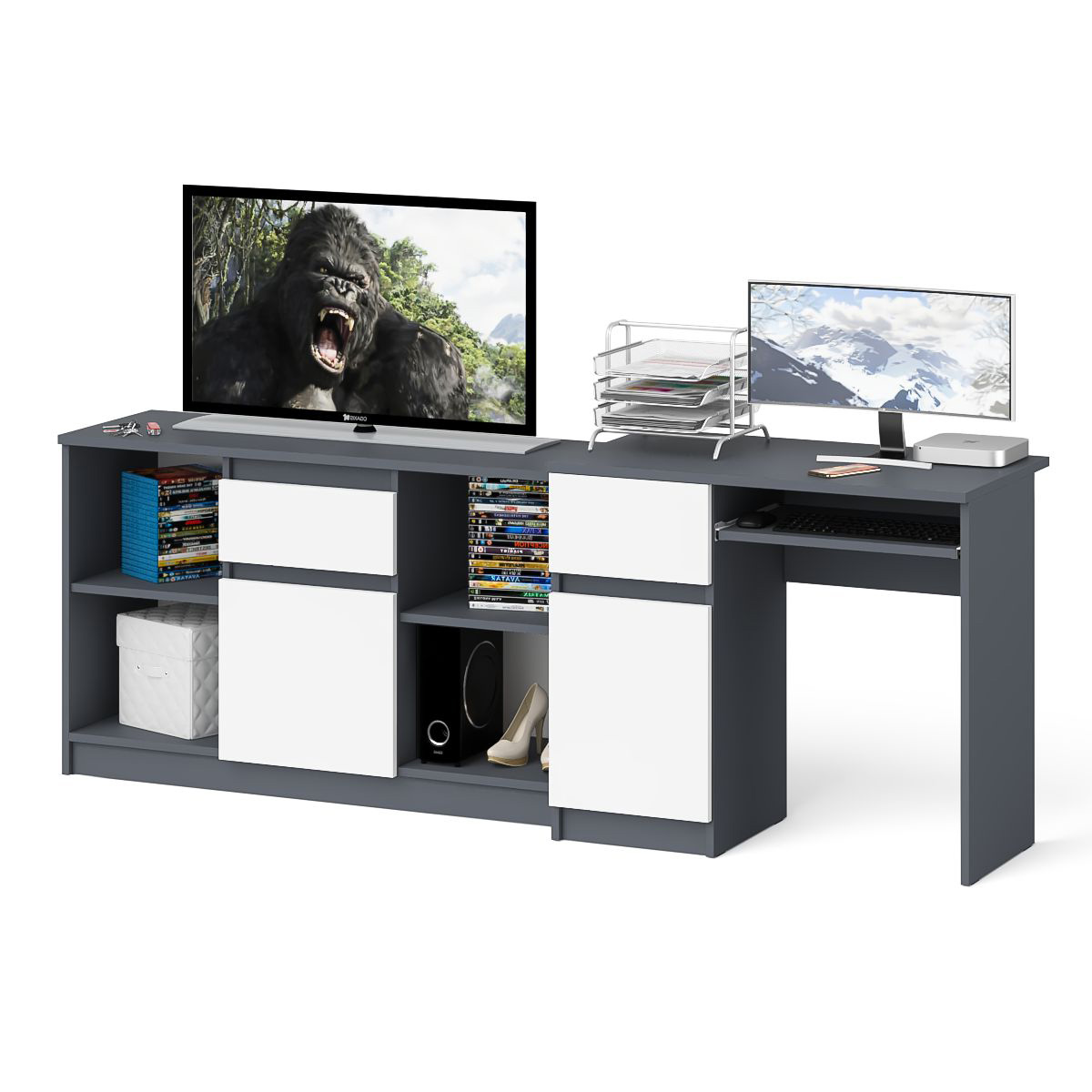 Комплектация включает стол компьютерный Мори МС-1 левый и тумбу ТВ Мори МТВ1204.1. Продуманная конструкция позволяет убрать лишние предметы, тем самым сохраняя единый стиль оформления помещения. Отсутствие ручек главное преимущество данной модели. Роль ручек выполняют сами фасады. Небольшой стол компьютерный Мори МС-1 левый с тумбой и выдвижной панелью для клавиатуры. Тумба имеет нишу с полочкой за распашной дверкой и выдвижной ящик на роликовых направляющих. Стол компьютерный Мори МС-1 левый не имеет универсальной сборки - выдвижной ящик расположен слева. Тумба ТВ Мори МТВ1204.1 состоит из двух открытых ниш по бокам и ящика и закрытой нишей по центру. Все ниши имеет полочку по середине. На тумбе достаточно места для размещения телевизора дигональю 47 дюймов. Можно использовать как ТВ тумбу, так и обычную для хранения и размещения Ваших вещей.