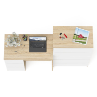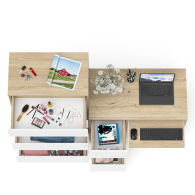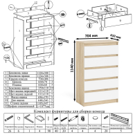 Открывание ящиков производится за счет пространства между планками и фасадами. Выдвижные ящики на роликовых направляющих L=350 мм неполного выдвижения обеспечивают комфортную эксплуатацию. На нижних кромках опор предусмотрены пластиковые подпятники для защиты поверхности пола от механических повреждений. Поставляется в разобранном виде в надёжной упаковке, с комплектом сборочной фурнитуры и инструкцией по сборке.