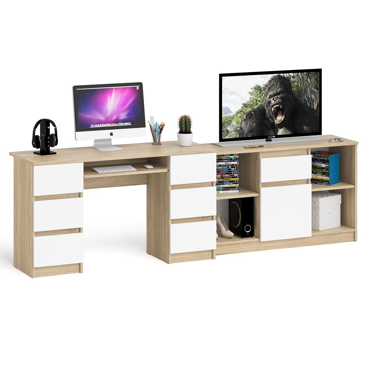 Комплектация включает компьютерный стол Мори МС-2 и тумбу ТВ Мори МТВ1204.1. Продуманная конструкция позволяет убрать лишние предметы, тем самым сохраняя единый стиль оформления помещения. Роль ручек выполняют сами фасады. Стол с 2 тумбами оборудован 6 ящиками и выдвижной полкой для клавиатуры. Под столешницей по бокам расположены две тумбы с тремя выдвижными ящиками в каждой. Тумба ТВ Мори МТВ1204.1 состоит из двух открытых ниш по бокам и ящика и закрытой нишей по центру. Все ниши имеет полочку по середине. На тумбе достаточно места для размещения телевизора дигональю 47 дюймов. Можно использовать как ТВ тумбу, так и обычную для хранения и размещения Ваших вещей.