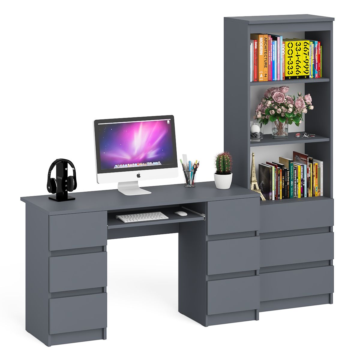 Комплектация включает компьютерный стол Мори МС-2 и стеллаж с ящиками Мори МСТ600. Продуманная конструкция позволяет убрать лишние предметы, тем самым сохраняя единый стиль оформления помещения. Роль ручек выполняют сами фасады. Стол с 2 тумбами оборудован 6 ящиками и выдвижной полкой для клавиатуры. Под столешницей по бокам расположены две тумбы с тремя выдвижными ящиками в каждой. Стеллаж Мори МСТ600 с двумя открытыми полками сверху и тремя выдвижными ящиками снизу.