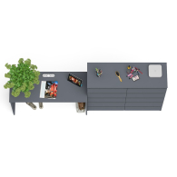 Открывание ящиков производится за счет пространства между планками и фасадами. Выдвижные ящики на роликовых направляющих L=350 мм неполного выдвижения обеспечивают комфортную эксплуатацию. На нижних кромках опор предусмотрены пластиковые подпятники для защиты поверхности пола от механических повреждений. Поставляется в разобранном виде в надёжной упаковке, с комплектом сборочной фурнитуры и инструкцией по сборке.