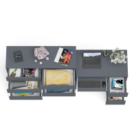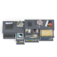 Открывание ящиков производится за счет пространства между планками и фасадами. Выдвижные ящики на роликовых направляющих L=350 мм неполного выдвижения обеспечивают комфортную эксплуатацию. На нижних кромках опор предусмотрены пластиковые подпятники для защиты поверхности пола от механических повреждений. Поставляется в разобранном виде в надёжной упаковке, с комплектом сборочной фурнитуры и инструкцией по сборке.