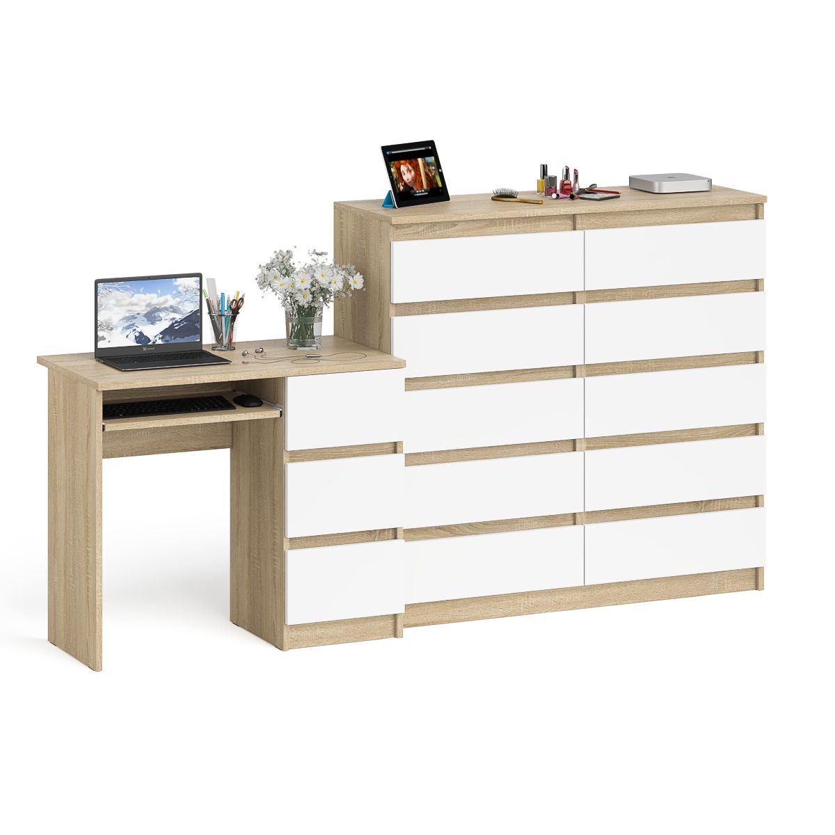 Отзывы о Столплит Стол с тремя выдвижными ящиками компьютерный правый с комодом на 10-ть ящиков Мори Дуб Сонома, Белый
