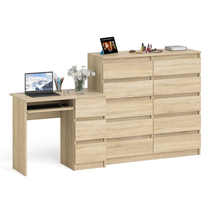 Отзывы о Столплит Стол с тремя выдвижными ящиками компьютерный правый с комодом на 10-ть ящиков Мори Дуб Сонома