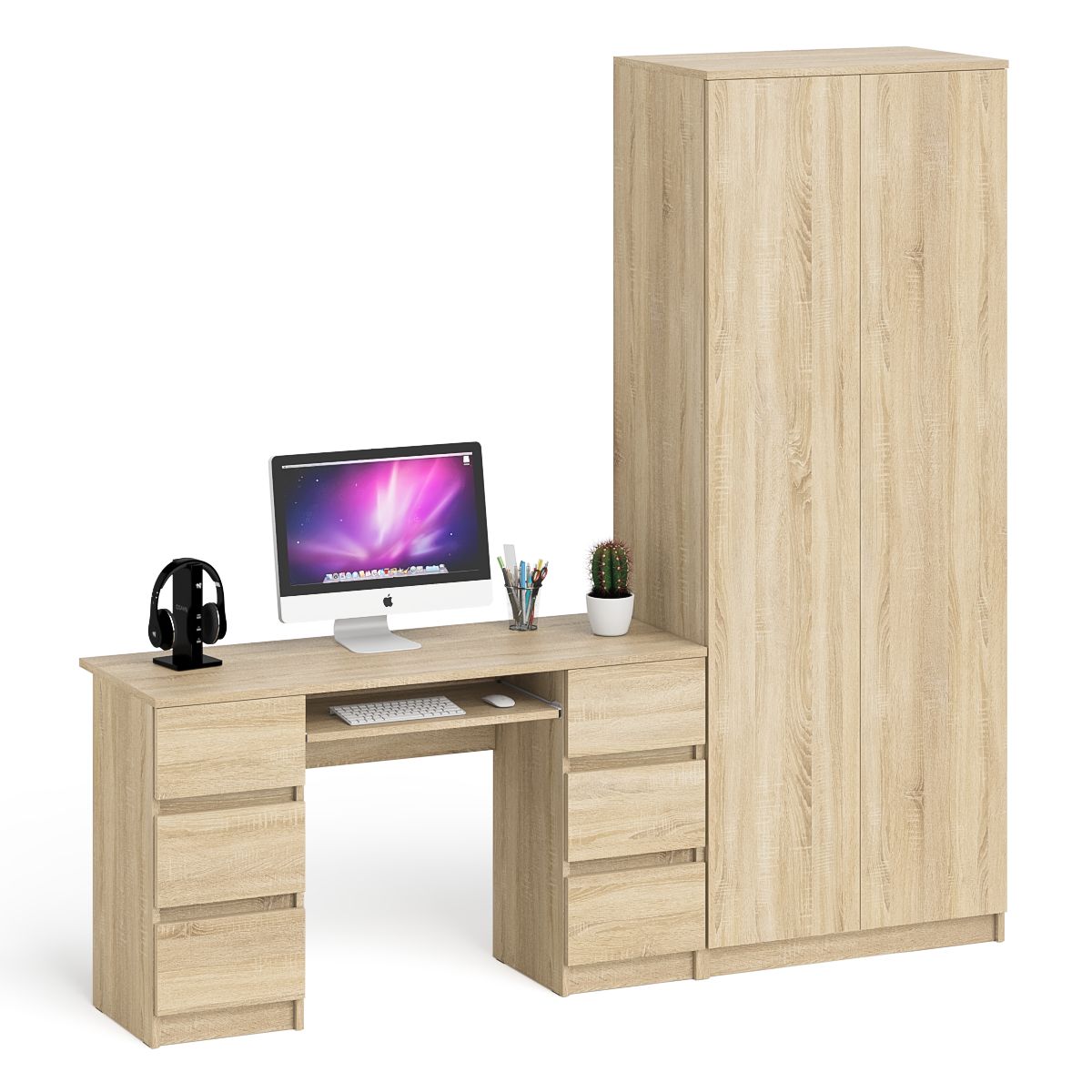 Комплектация включает компьютерный стол Мори МС-2 и шкаф двухдверный Мори МШ800.1. Продуманная конструкция позволяет убрать лишние предметы, тем самым сохраняя единый стиль оформления помещения. Роль ручек выполняют сами фасады. Стол с 2 тумбами оборудован 6 ящиками и выдвижной полкой для клавиатуры. Под столешницей по бокам расположены две тумбы с тремя выдвижными ящиками в каждой. Шкаф Мори МШ800.1 оборудован двумя распашными дверями. За дверями расположены горизонтальная штанга (762 мм.) для одежды на плечиках, антресольная полка для головных уборов и нижняя ниша.
