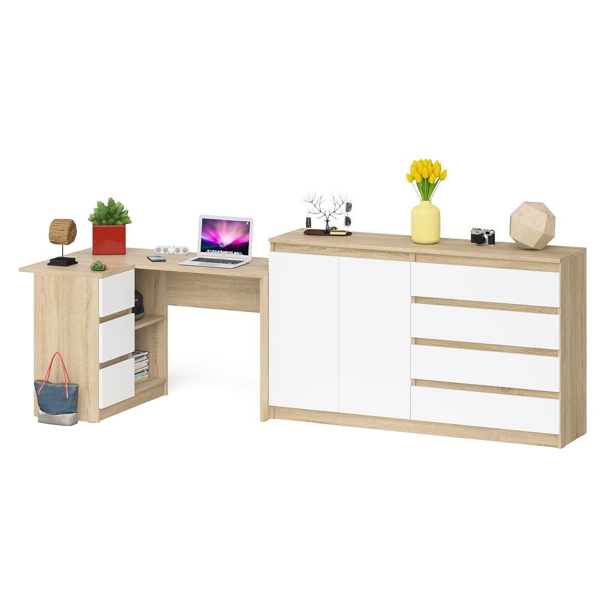 Комплектация включает стол компьютерный Мори МС-16 левый и комод Мори МК1600.1. Продуманная конструкция позволяет убрать лишние предметы, тем самым сохраняя единый стиль оформления помещения. Роль ручек выполняют сами фасады. Угловой компьютерный стол Мори МС-16 левый - конструктивно тумба со столешницей образуют угол. Тумба имеет 3 выдвижных ящика и нишу с полкой по середине. Угловой компьютерный стол Мори МС-16 левый не универсален при сборке - тумба с ящиками располагается слева. Широкий Мори МК1600.1 комод оборудован четырьмя выдвижными ящиками с одной стороны и закрытым отделением с полкой за двумя распашными дверками. Комод не имеет универсальной сборки - ящики расположены справа.