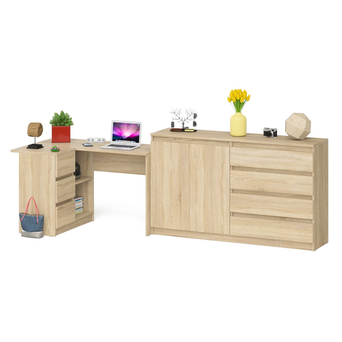 Комплектация включает стол компьютерный Мори МС-16 левый и комод Мори МК1600.1. Продуманная конструкция позволяет убрать лишние предметы, тем самым сохраняя единый стиль оформления помещения. Роль ручек выполняют сами фасады. Угловой компьютерный стол Мори МС-16 левый - конструктивно тумба со столешницей образуют угол. Тумба имеет 3 выдвижных ящика и нишу с полкой по середине. Угловой компьютерный стол Мори МС-16 левый не универсален при сборке - тумба с ящиками располагается слева. Широкий Мори МК1600.1 комод оборудован четырьмя выдвижными ящиками с одной стороны и закрытым отделением с полкой за двумя распашными дверками. Комод не имеет универсальной сборки - ящики расположены справа.