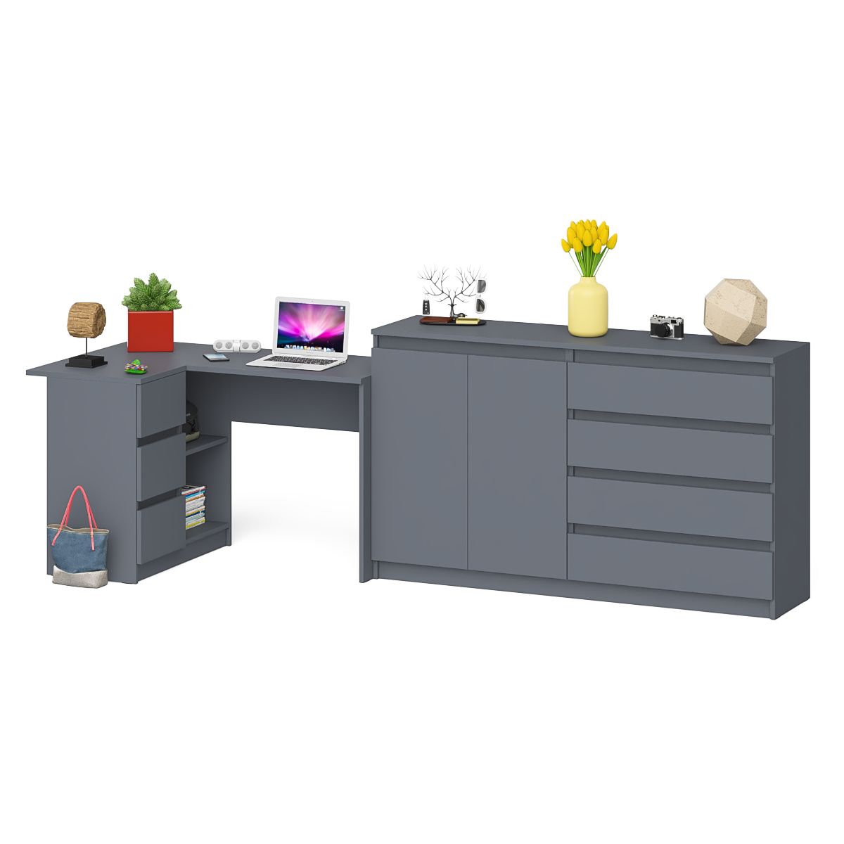 Комплектация включает стол компьютерный Мори МС-16 левый и комод Мори МК1600.1. Продуманная конструкция позволяет убрать лишние предметы, тем самым сохраняя единый стиль оформления помещения. Роль ручек выполняют сами фасады. Угловой компьютерный стол Мори МС-16 левый - конструктивно тумба со столешницей образуют угол. Тумба имеет 3 выдвижных ящика и нишу с полкой по середине. Угловой компьютерный стол Мори МС-16 левый не универсален при сборке - тумба с ящиками располагается слева. Широкий Мори МК1600.1 комод оборудован четырьмя выдвижными ящиками с одной стороны и закрытым отделением с полкой за двумя распашными дверками. Комод не имеет универсальной сборки - ящики расположены справа.