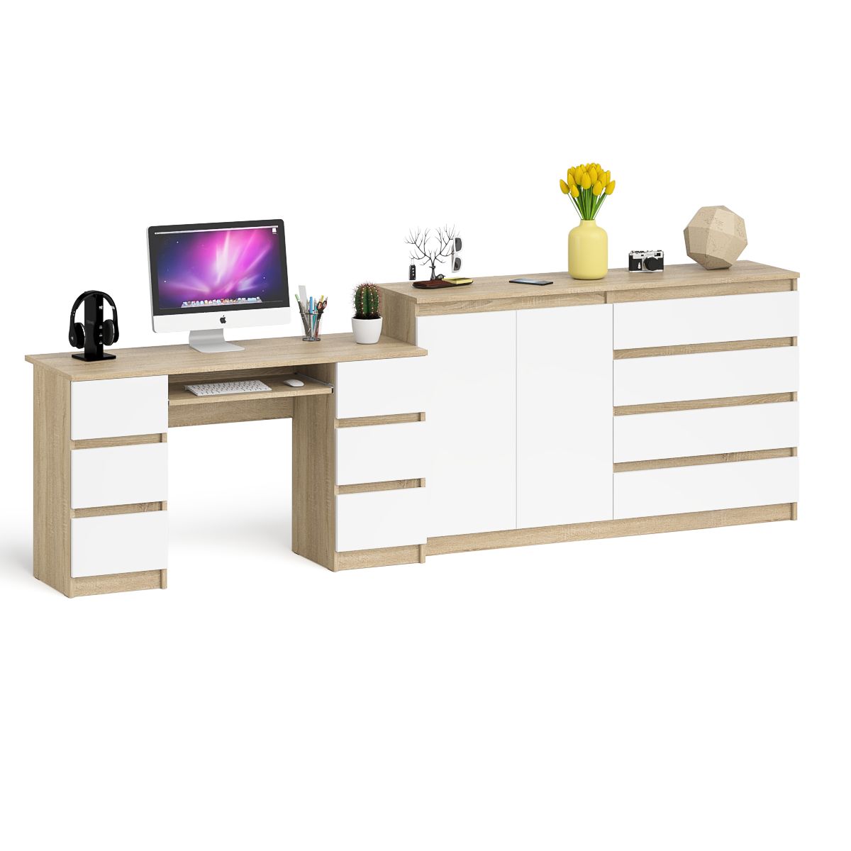 Комплектация включает компьютерный стол Мори МС-2 и комод Мори МК1600.1. Продуманная конструкция позволяет убрать лишние предметы, тем самым сохраняя единый стиль оформления помещения. Роль ручек выполняют сами фасады. Стол с 2 тумбами оборудован 6 ящиками и выдвижной полкой для клавиатуры. Под столешницей по бокам расположены две тумбы с тремя выдвижными ящиками в каждой. Широкий Мори МК1600.1 комод оборудован четырьмя выдвижными ящиками с одной стороны и закрытым отделением с полкой за двумя распашными дверками. Комод не имеет универсальной сборки - ящики расположены справа.