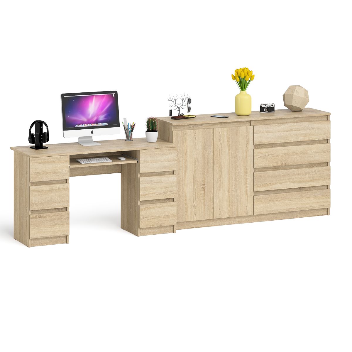 Комплектация включает компьютерный стол Мори МС-2 и комод Мори МК1600.1. Продуманная конструкция позволяет убрать лишние предметы, тем самым сохраняя единый стиль оформления помещения. Роль ручек выполняют сами фасады. Стол с 2 тумбами оборудован 6 ящиками и выдвижной полкой для клавиатуры. Под столешницей по бокам расположены две тумбы с тремя выдвижными ящиками в каждой. Широкий Мори МК1600.1 комод оборудован четырьмя выдвижными ящиками с одной стороны и закрытым отделением с полкой за двумя распашными дверками. Комод не имеет универсальной сборки - ящики расположены справа.