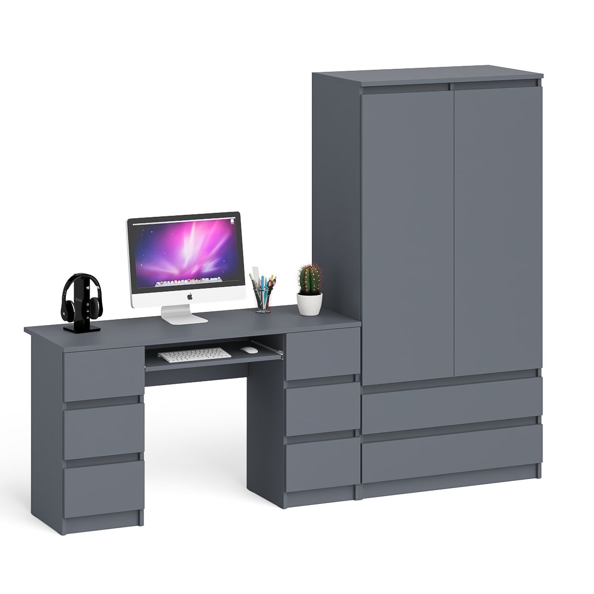 Комплектация включает компьютерный стол Мори МС-2 и шкаф-комод Мори МШ900.1. Продуманная конструкция позволяет убрать лишние предметы, тем самым сохраняя единый стиль оформления помещения. Роль ручек выполняют сами фасады. Стол с 2 тумбами оборудован 6 ящиками и выдвижной полкой для клавиатуры. Под столешницей по бокам расположены две тумбы с тремя выдвижными ящиками в каждой. Шкаф-комод Мори МШ900.1 оборудован двумя распашными дверями сверху и двумя выдвижными ящиками снизу. За дверями расположены два отделения с одной стороны с горизонтальной штангой (420 мм.) для одежды на плечиках, с другой с тремя полками.