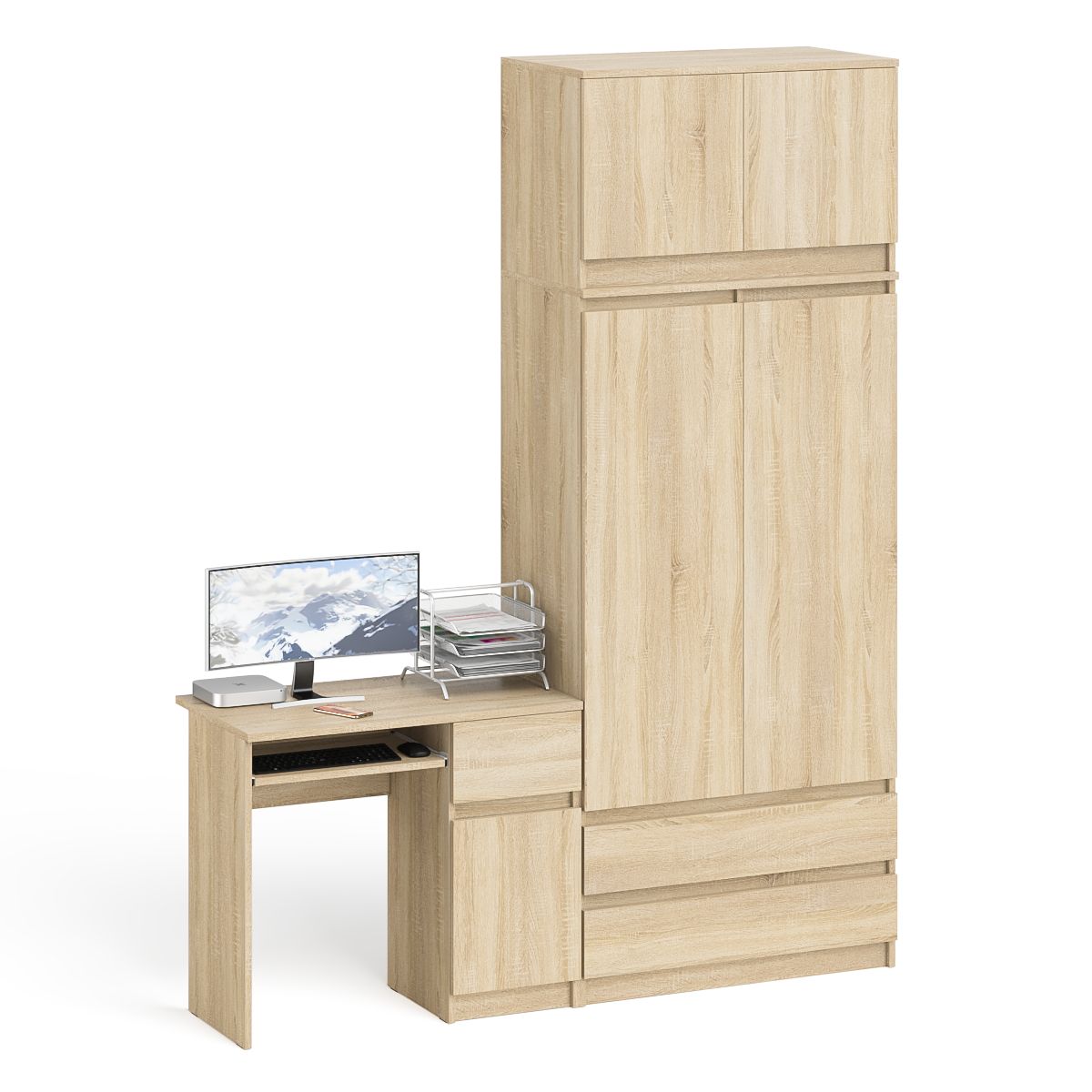 Комплектация включает стол компьютерный Мори МС-1 правый , шкаф-комод Мори МШ900.1 и антресоль Мори МА900.1. Продуманная конструкция позволяет убрать лишние предметы, тем самым сохраняя единый стиль оформления помещения. Роль ручек выполняют сами фасады. Аккуратный стол Мори МС-1 правый компьютерный с тумбой и выдвижной панелью для клавиатуры. Тумба имеет нишу с полочкой за распашной дверкой и выдвижной ящик на роликовых направляющих. Стол компьютерный Мори МС-1 правый не имеет универсальной сборки - выдвижной ящик расположен справа. Шкаф-комод Мори МШ900.1 оборудован двумя распашными дверями сверху и двумя выдвижными ящиками снизу. За дверями расположены два отделения с одной стороны с горизонтальной штангой (420 мм.) для одежды на плечиках, с другой с тремя полками. За распашными дверками антресоли Мори МА900.1 расположена полка по центру, что позволяет убрать лишние предметы, тем самым сохраняя единый стиль оформления помещения.