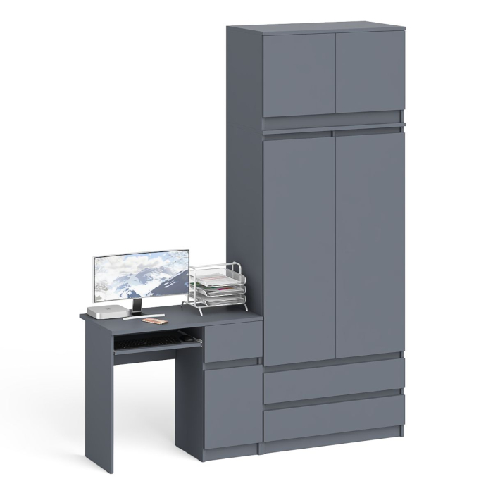 Комплектация включает стол компьютерный Мори МС-1 правый , шкаф-комод Мори МШ900.1 и антресоль Мори МА900.1. Продуманная конструкция позволяет убрать лишние предметы, тем самым сохраняя единый стиль оформления помещения. Роль ручек выполняют сами фасады. Аккуратный стол Мори МС-1 правый компьютерный с тумбой и выдвижной панелью для клавиатуры. Тумба имеет нишу с полочкой за распашной дверкой и выдвижной ящик на роликовых направляющих. Стол компьютерный Мори МС-1 правый не имеет универсальной сборки - выдвижной ящик расположен справа. Шкаф-комод Мори МШ900.1 оборудован двумя распашными дверями сверху и двумя выдвижными ящиками снизу. За дверями расположены два отделения с одной стороны с горизонтальной штангой (420 мм.) для одежды на плечиках, с другой с тремя полками. За распашными дверками антресоли Мори МА900.1 расположена полка по центру, что позволяет убрать лишние предметы, тем самым сохраняя единый стиль оформления помещения.