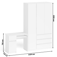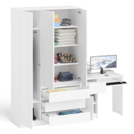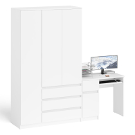 Комплектация включает стол компьютерный Мори МС-1 левый и широкий шкаф-комод Мори МШ1200.1. Продуманная конструкция позволяет убрать лишние предметы, тем самым сохраняя единый стиль оформления помещения. Роль ручек выполняют сами фасады. Небольшой стол компьютерный Мори МС-1 левый с тумбой и выдвижной панелью для клавиатуры. Тумба имеет нишу с полочкой за распашной дверкой и выдвижной ящик на роликовых направляющих. Стол компьютерный Мори МС-1 левый не имеет универсальной сборки - выдвижной ящик расположен слева. Широкий шкаф-комод Мори МШ1200.1 оборудован тремя распашными дверями и тремя выдвижными ящиками. Слева за дверкой расположено отделение с горизонтальной штангой (372 мм) для одежды на плечиках, антресольной полкой и нижней нишей. Справа сверху за дверьми отделение с тремя полками и снизу тремя выдвижными ящиками. Шкаф-комод не универсален при сборке - отделение с ящиками располагается только справа.