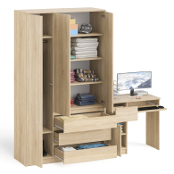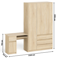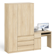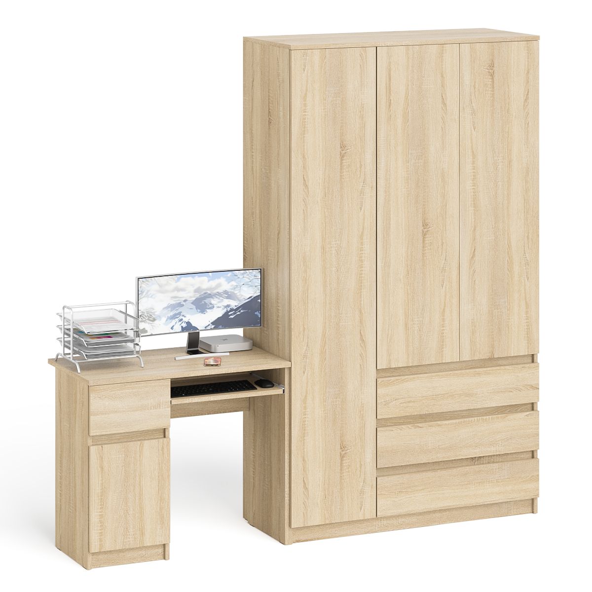 Комплектация включает стол компьютерный Мори МС-1 левый и широкий шкаф-комод Мори МШ1200.1. Продуманная конструкция позволяет убрать лишние предметы, тем самым сохраняя единый стиль оформления помещения. Роль ручек выполняют сами фасады. Небольшой стол компьютерный Мори МС-1 левый с тумбой и выдвижной панелью для клавиатуры. Тумба имеет нишу с полочкой за распашной дверкой и выдвижной ящик на роликовых направляющих. Стол компьютерный Мори МС-1 левый не имеет универсальной сборки - выдвижной ящик расположен слева. Широкий шкаф-комод Мори МШ1200.1 оборудован тремя распашными дверями и тремя выдвижными ящиками. Слева за дверкой расположено отделение с горизонтальной штангой (372 мм) для одежды на плечиках, антресольной полкой и нижней нишей. Справа сверху за дверьми отделение с тремя полками и снизу тремя выдвижными ящиками. Шкаф-комод не универсален при сборке - отделение с ящиками располагается только справа.