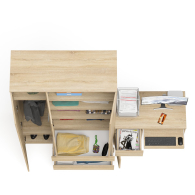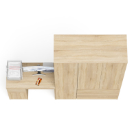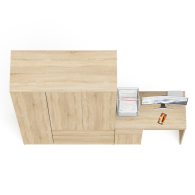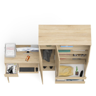 Открывание ящиков и дверей производится за счет пространства между планками и фасадами, высокой двери - за счет системы «Push-to-open». Выдвижные ящики на роликовых направляющих (стола L=350 мм, шкафа L=400 мм) неполного выдвижения обеспечивают комфортную эксплуатацию. На нижних кромках опор предусмотрены пластиковые подпятники для защиты поверхности пола от механических повреждений. Поставляется в разобранном виде в надёжной упаковке, с комплектом сборочной фурнитуры и инструкцией по сборке.