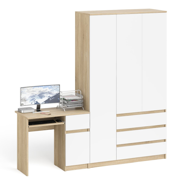 Комплектация включает стол компьютерный Мори МС-1 правый и широкий шкаф-комод Мори МШ1200.1. Продуманная конструкция позволяет убрать лишние предметы, тем самым сохраняя единый стиль оформления помещения. Роль ручек выполняют сами фасады. Аккуратный стол Мори МС-1 правый компьютерный с тумбой и выдвижной панелью для клавиатуры. Тумба имеет нишу с полочкой за распашной дверкой и выдвижной ящик на роликовых направляющих. Стол компьютерный Мори МС-1 правый не имеет универсальной сборки - выдвижной ящик расположен справа. Широкий шкаф-комод Мори МШ1200.1 оборудован тремя распашными дверями и тремя выдвижными ящиками. Слева за дверкой расположено отделение с горизонтальной штангой (372 мм) для одежды на плечиках, антресольной полкой и нижней нишей. Справа сверху за дверьми отделение с тремя полками и снизу тремя выдвижными ящиками. Шкаф-комод не универсален при сборке - отделение с ящиками располагается только справа.