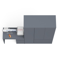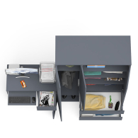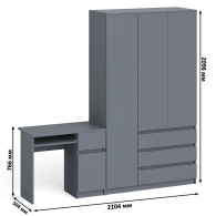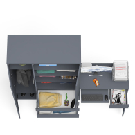 Открывание ящиков и дверей производится за счет пространства между планками и фасадами, высокой двери - за счет системы «Push-to-open». Выдвижные ящики на роликовых направляющих (стола L=350 мм, шкафа L=400 мм) неполного выдвижения обеспечивают комфортную эксплуатацию. На нижних кромках опор предусмотрены пластиковые подпятники для защиты поверхности пола от механических повреждений. Поставляется в разобранном виде в надёжной упаковке, с комплектом сборочной фурнитуры и инструкцией по сборке.