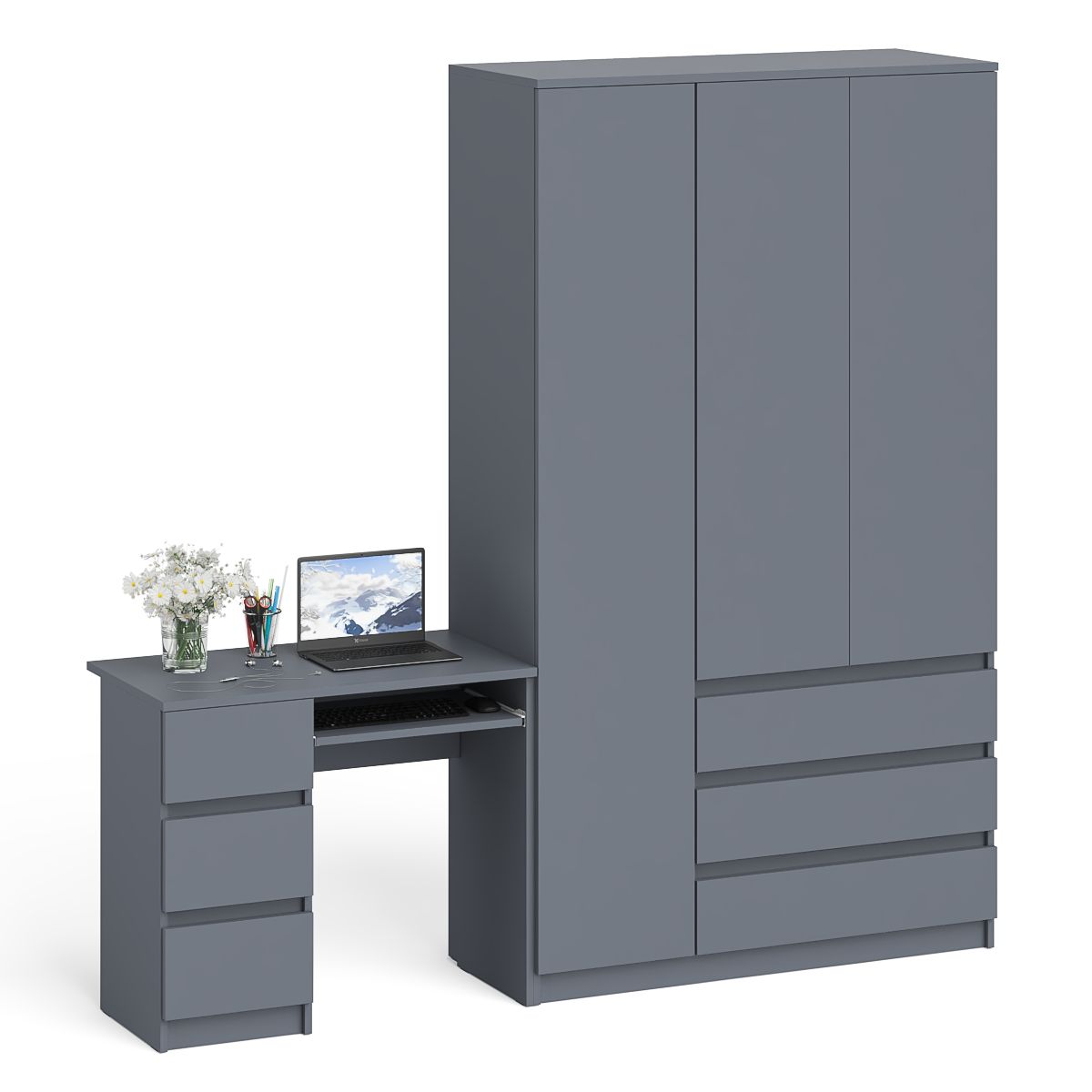 Комплектация включает стол компьютерный Мори МС-6 левый и широкий шкаф-комод Мори МШ1200.1. Продуманная конструкция позволяет убрать лишние предметы, тем самым сохраняя единый стиль оформления помещения. Роль ручек выполняют сами фасады. Небольшой Стол Мори МС-6 левый компьютерный с тумбой и выдвижной панелью для клавиатуры. Тумба имеет три выдвижных ящика на роликовых направляющих. Стол компьютерный три ящика Мори МС-6 левый не имеет универсальной сборки - выдвижной ящик расположен слева. Широкий шкаф-комод Мори МШ1200.1 оборудован тремя распашными дверями и тремя выдвижными ящиками. Слева за дверкой расположено отделение с горизонтальной штангой (372 мм) для одежды на плечиках, антресольной полкой и нижней нишей. Справа сверху за дверьми отделение с тремя полками и снизу тремя выдвижными ящиками. Шкаф-комод не универсален при сборке - отделение с ящиками располагается только справа.